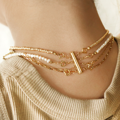 Mit diesen qualitativ hochwertigen Edelstahlbasics gestalten Sie wunderschönen Schmuck. Wie wäre es zum Beispiel mit einer Kette im Layered-Look? Dazu empfehlen wir den Edelstahlverschluss, an dem Sie drei Ketten befestigen können. Gestalten Sie eine längere Jasseron-Kette, an der Sie eine Tube-Perle befestigen. Mit dem Nietstift mit kleiner Kugel wird aus der Perle im Handumdrehen ein schöner Anhänger. Gestalten Sie kleine Blumen aus Süßwasserperlen und Rocailles-Perlen und befestigen Sie die Blumen an zwei kürzeren Ketten. Die Schlüsselanhänger sehen schön zu Macramé-Band oder Wachskordel aus.
