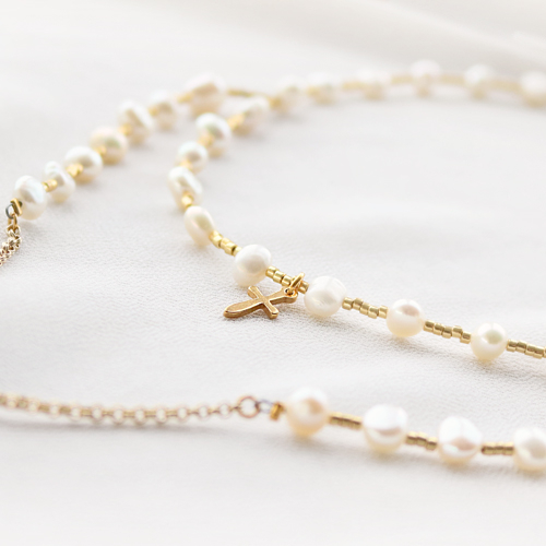 Schmuck ist oft ein Symbol für etwas oder jemanden. Indem Sie Ihrem Schmuck religiöse Symbole hinzufügen, können Sie das verstärken. Zur Inspiration haben wir ein wunderschönes Schmuckset entworfen, das beweist, dass Trend und Symbolik gut zusammenpassen. Die Metall Anhänger DQ in goldfarben in Kombination mit den Süßwasserperlen ergeben einen fantastischen Effekt. Sie können diese Teile auch verwenden, um einen wunderschönen Rosenkranz oder Armbänder mit religiösem AnhÄnger zu machen.