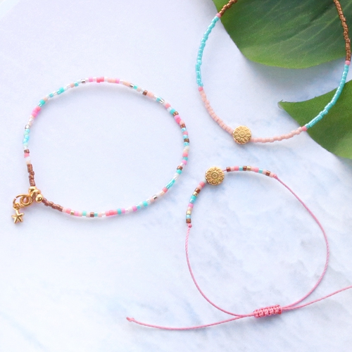 Den herrlichsten, fröhlichsten und minimalistischen Schmuck machen Sie mit Miyuki! Diese Armbänder sind echt perfekt für den Sommer! Mit Miyuki sind viele Techniken verwendbar, aber Sie können auch einfach, genau wie wir, Armbänder reihen auf Elastik, Nylon S-Ion Draht und Eisendraht. Diese Perlen geben einem einfachen Armband nämlich einen super Effekt. Die Miyuki Delicas kombinieren wir mit andern Muscheln, DQ Metall Schmuckzubehör und Quasten. Die können endlos viele Kombinationen machen mit diesen hübschen Perlen!