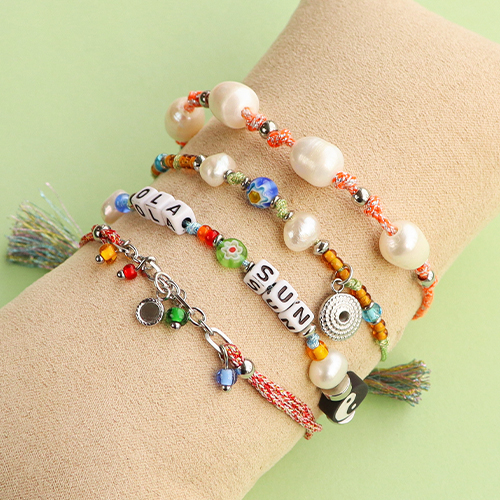 Mit Makramee-Band können Sie ganz einfach unwiderstehliche Armbänder herstellen. Fädeln Sie eine Perlenmischung auf, z. B. Polymerperlen, Natursteinperlen und Edelstahlperlen, und machen Sie nach jeder Perle einen Knoten. Edel sehen die Armbänder mit einem Zwischenstück aus Jasseron aus. Daran befestigen Sie Ihre eigenen Anhänger oder Quasten, die Sie mit diesem Band ebenfalls selbst fertigen und genau auf die von Ihnen gewünschte Länge zurechtschneiden können. Oder gestalten eine Handykette, der Sie mit Buchstabenperlen eine persönliche Note geben!