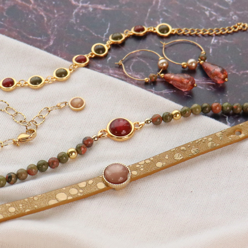 Bevor Sie einen Cabochon in eine Fassung kleben, müssen Sie zuerst entscheiden, was Sie mit dem Cabochon machen wollen. Dann entscheiden Sie sich für einen Anhänger oder ein Zwischenstück. Verwenden Sie zum Beispiel nur Zwischenstücke, um ein Armband nur aus Cabochons herzustellen, oder kombinieren Sie einen Cabochon mit Natursteinperlen, die Sie auf ein Makramee-Band auffädeln. Die Cabochons sehen auch in Kombination mit den Cuoio-Lederarmbändern aus unserer Kollektion hervorragend aus. Verwandeln Sie die Perlen in schöne Anhänger, die Sie als weiteren Blickfang an eine Kette hängen.