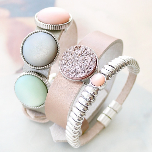 Dieser stilvolle Schmuck ist ein echter Gewinn für Ihre Frühlingskollektion! Die neuen Cabochons von Polaris Elements haben eine luxuriöse Ausstrahlung. In Kombination mit DQ Metall und Designer Quality Leder oder einem Polaris Cuoio Armband ist das super schick. Verwend Pastelltöne Cabochons in Kombination mit Cuoio Armbändern oder DQ Leder in Metallic Farben. Das passt super zusammen, zu dem DQ Metall und gibt einen prachtvollen Kontrast. Unser Liebling aus diesem Inspirationsset sind echt die DQ Leder Armbänder mit Cabochons und Designer Quality Metall Schieber, so schick! Die zarten Farben sind auch noch absolut Sommer und frühlingstauglich!