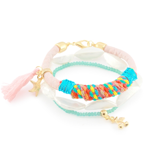 Der Sommer hat jetzt endlich angefangen! Also höchste Zeit um wieder fröhlichen Sommerschmuck zu tragen. Dieses Inspirationsset besteht aus hübschen Armbändern aus gestepptem Imitat Leder, Facett Perlen, Muschelperlen und Dreamz Band. Die Farben des Dreamz Band sind super fröhlich! An dem Dreamz Band ist ein DQ Metall Schieber in Kombination mit einem 12mm Polaris Cabochon verarbeitet. Es gibt ein Imitat gestepptes Leder Armband aus Macramé Draht und Facettperlen mit Elastik drum herum gereiht. Um das andere Imitat Leder Armband gesteppt ist Dreamz Band gewickelt in Kombination mit Macramé Draht. Um alles einen schönen Abschluss zu geben, können Sie Sommer DQ metall Anhänger oder Quaste an diese Armbänder verarbeiten.