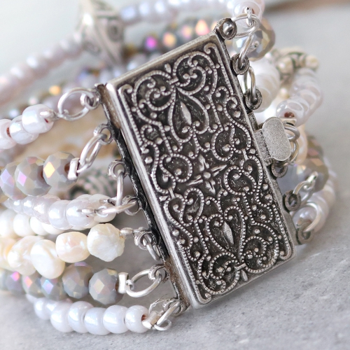 Diese herrlichen Schmuck-Ideen zeigen Ihnen nur einen kleinen Teil der mega grossen Selektion neues Schmuck Zubehör, Perlen und Anhänger aus TQ Metall. Wir haben das Metall in verschiedenen Schmuckstücken kombiniert mit Rocailles, Süsswasserperlen und Facettperlen in weiss und grauen Tönen. Sieht das nicht frisch und hip paus? Dank des prachtvollen Zubehör aus TQ Metall können Sie eine herrliche Lagenkette machen oder auch ein Lagenarmband aus einem TQ Metall Barockverschluss sieht super luxuriös und modern aus. Oder kombinieren die grossen TQ Metall Perlen und Schieber mit rundem gesteppten Leder DQ. Schieb auffallende Formen Schieber aus TQ Metall auf ein Lederarmband für einen auffallenden Look. Es gibt auch verschiedenes Zubehör für Ohrringe erhältlich aus TQ Metall. Kombinier mit Perlen und Jasseron und Zubehör aus DQ Metall für ein herrliches Resultat.