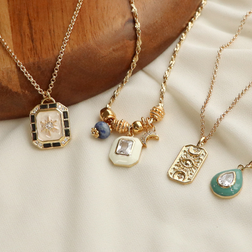 Diese Messinganhänger und Perlen mit Zirkonias eignen sich perfekt für die Gestaltung einer Kollektion hipper Halsketten im Stacking-Look. Bei diesem Trend trägt mehrere Halsketten in etwa gleicher Länge übereinander . Machen Sie Halsketten aus verschiedenen Jasseron-Ketten, an die Sie die Anhänger hängen. Dazu passen Halsketten, bei denen verschiedene Perlen wie Katsuki-Perlen, facettierte Perlen, Natursteinperlen und Polaris-Disc-Perlen verarbeitet wurden.
