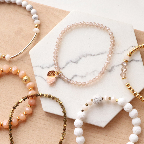 Mit den neuen Top-Facett-Perlen entwerfen Sie schönste Schmuckstücke in Ihren Lieblingsfarben! Für unsere Armbänder haben wir Top-Facett-Perlen mit anderen Perlen kombiniert. Reihen Sie zunächst die Top-Facett-Perlen auf Elastikband. Für einen verspielten Look einfach abwechselnd Top-Facett-Perlen und Metallperlen oder -anhänger in Designerqualität aufziehen. Verschließen Sie das Armband mit einem Knoten, den Sie mit Sekundenkleber verstärken. Angesagte Armbänder entstehen, wenn Sie Zwischenstücke und Anhänger aus Naturstein mit den Top-Facett-Perlen kombinieren. Tragen Sie die Top-Facett-Armbänder zusammen mit Armbändern aus Hermatit-Perlen und Katsuki-Lava-Perlen. Jetzt sind Sie dran – viel Erfolg!